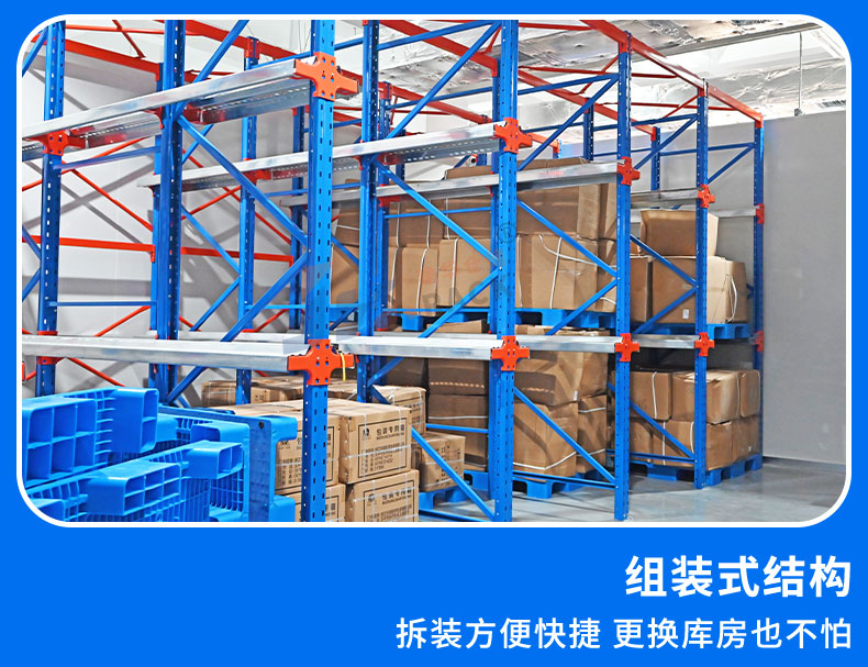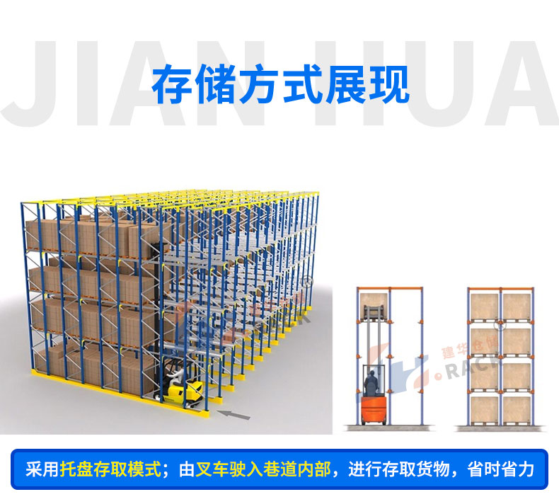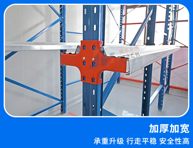 ★貨物存儲(chǔ)通道亦為叉車(chē)儲(chǔ)運(yùn)通道,是存儲(chǔ)密度較高的一種形式貨架。